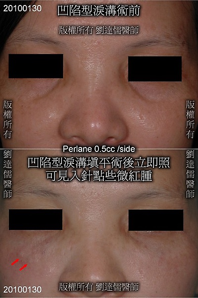 (圖:施打前後比較圖,可見施打後立即效果,而且僅有針孔處(紅色箭頭處)些微腫脹,過兩天即會完全消退)