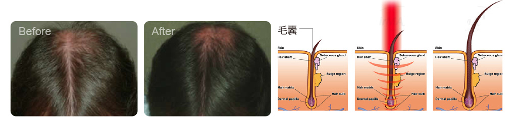 掉髮是許多人在意的問題,目前研究證實在特定波長670nm的紅光,可刺激頭皮毛囊活化,使血流豐富、預防大量落髮。有助於落髮情況不嚴重者、女性產後落髮及植髮後康復期患者的修復生長。