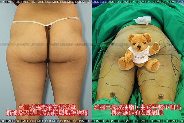 T小姐的臀部及大腿的上段有明顯的脂肪堆積。左腿抽脂完成可見左右的差異。