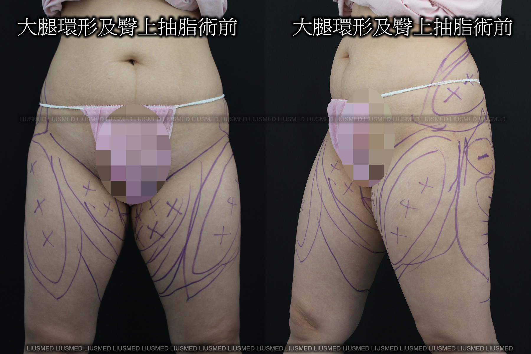 C小姐,30歲出頭,一直對大腿內側肥肉不甚滿意,因為減肥也減不下來,來找我希望幫她去除大腿內側肥肉。整體評估後,建議她要雕塑的地方不止是大腿內側,更應該包含外、前、後側及臀上曲線,因此,她接受大腿環形抽脂/溶脂及臀上抽脂/溶脂。
