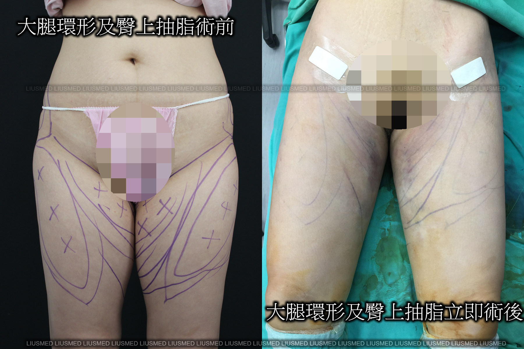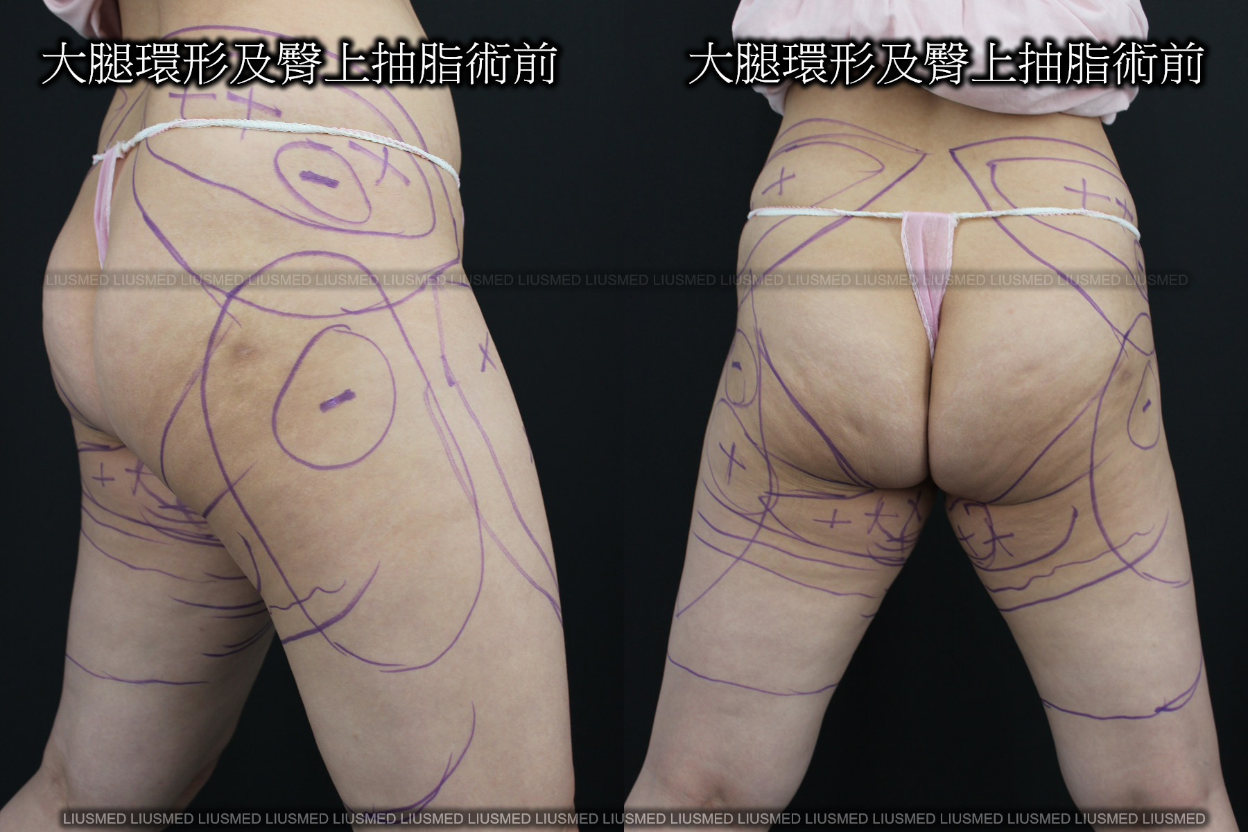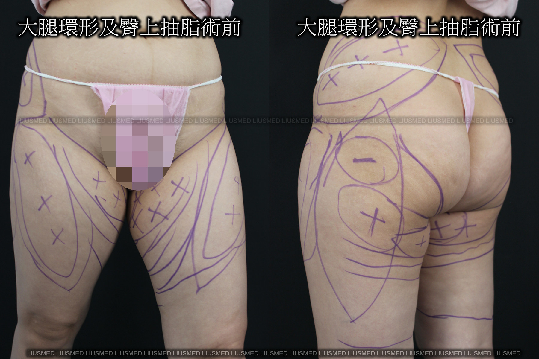 最後補充:此案例大腿環形抽脂及臀上部抽脂,手術時間共計2.5小時。傷口數目:正面左右各一個、背面左右各一個,總計四個傷口,每個傷口長度0.5公分,三個月到半年後淡化至肉眼不易察覺。