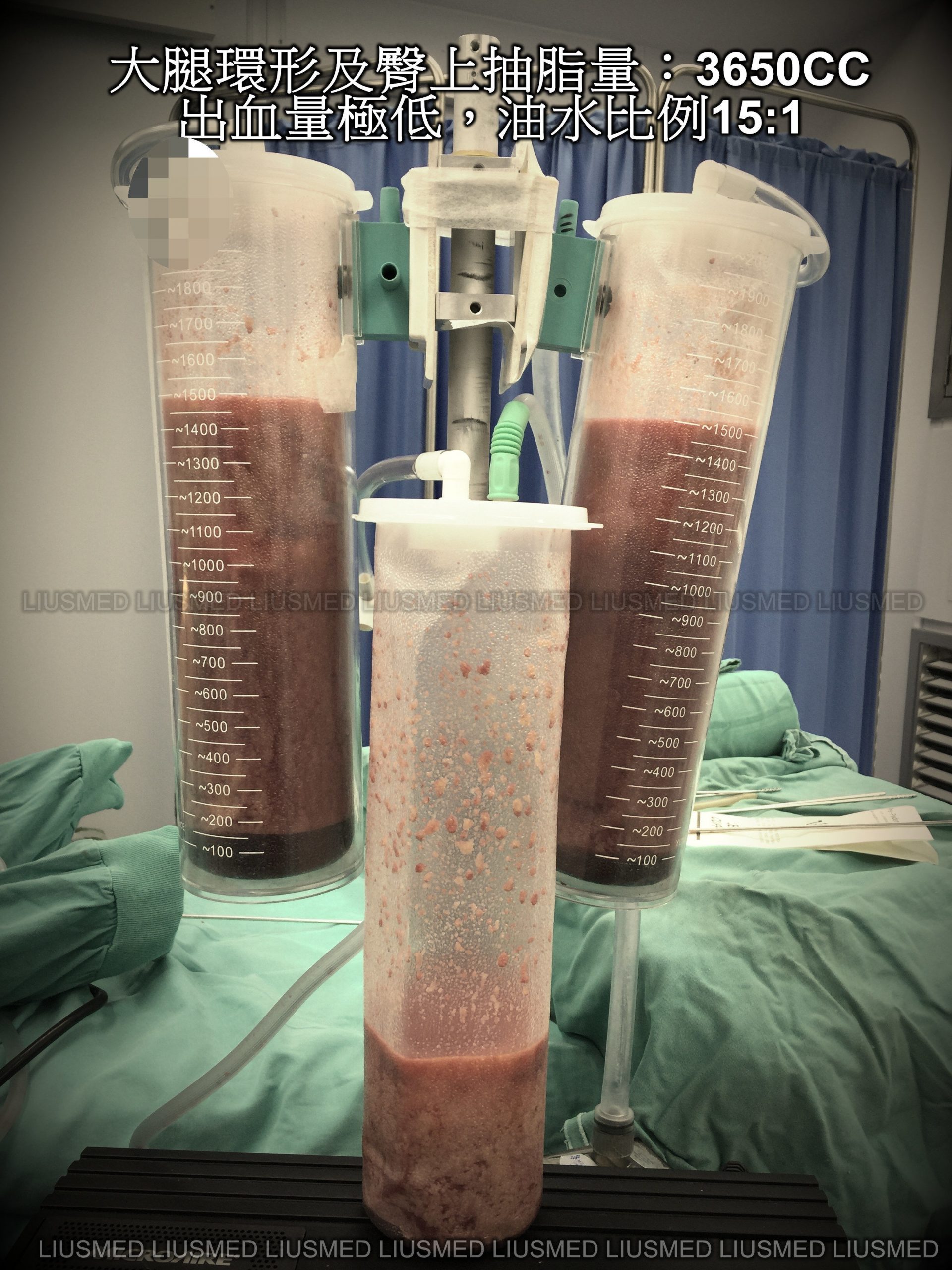 (上圖為C小姐的抽脂瓶,可見出血量極低,底部血水包含麻醉藥水才250CC,抽脂量為3650CC,油水比例約15:1)