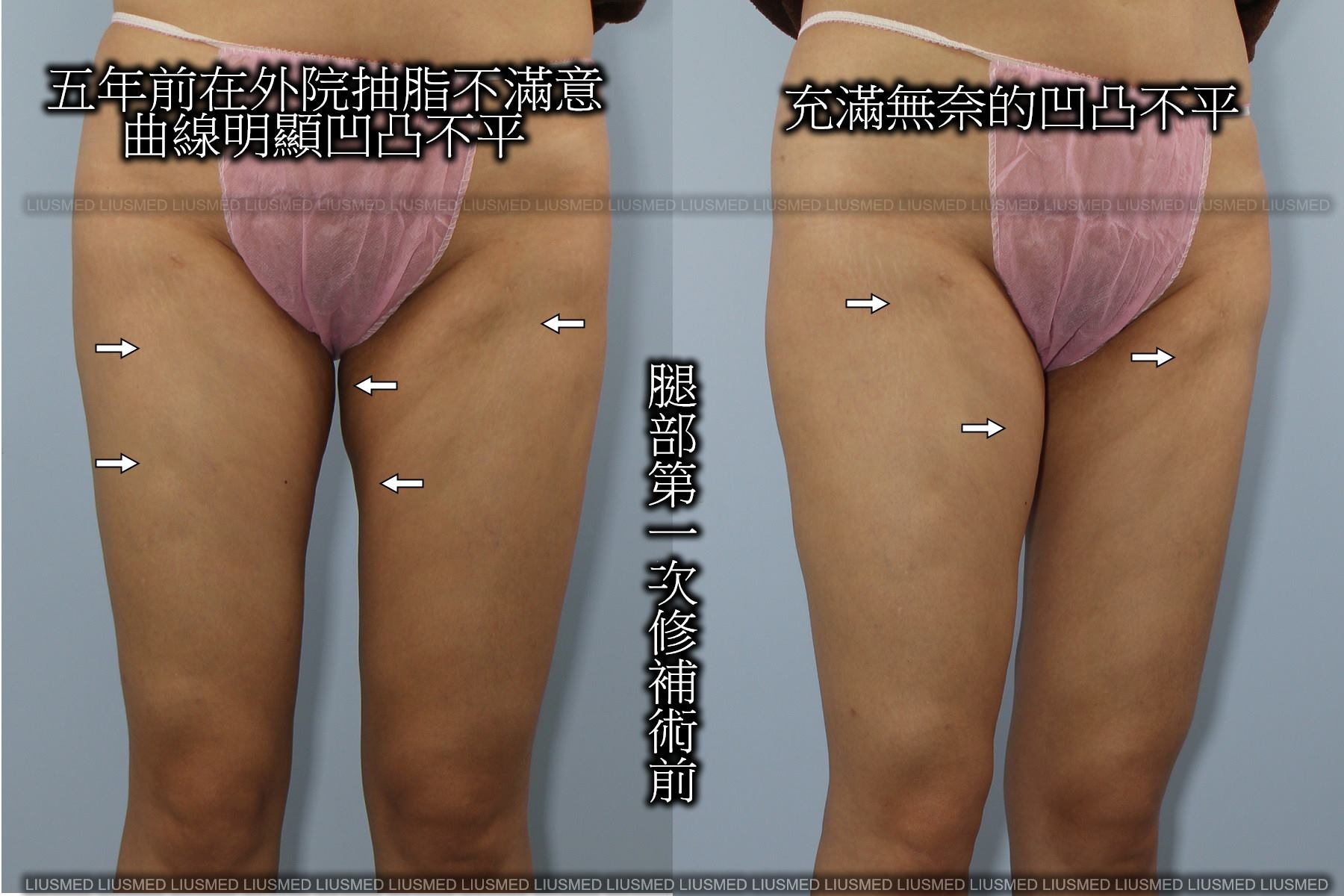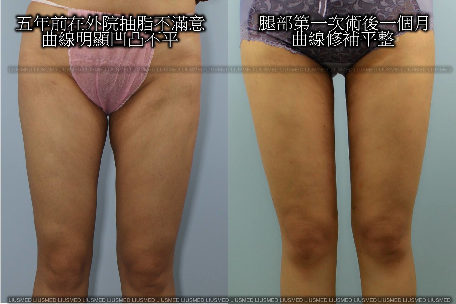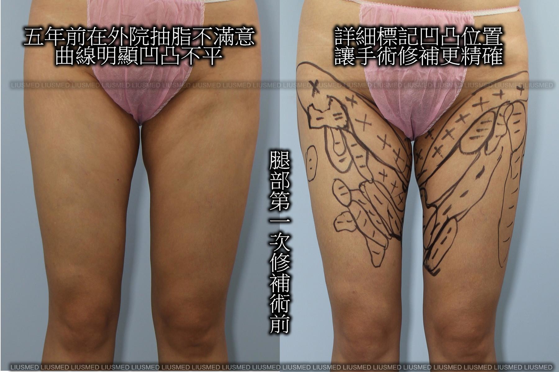 (上圖) 五年前外院抽脂失敗而產生的曲線凹凸不平,經由抽脂修復手術,回復了雙腿該有的平整曲線。