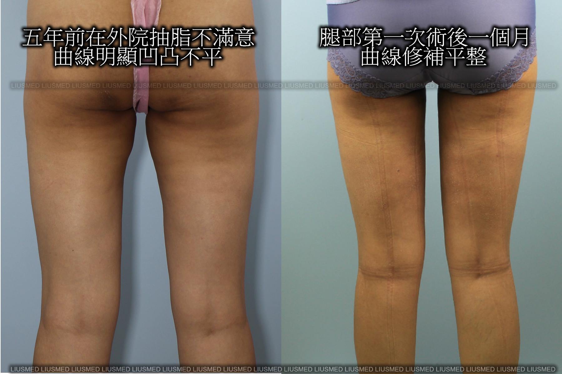 上圖右是術後一個月,經由抽脂修復手術,與圖左比對,可看出已回復雙腿該有的平整曲線。