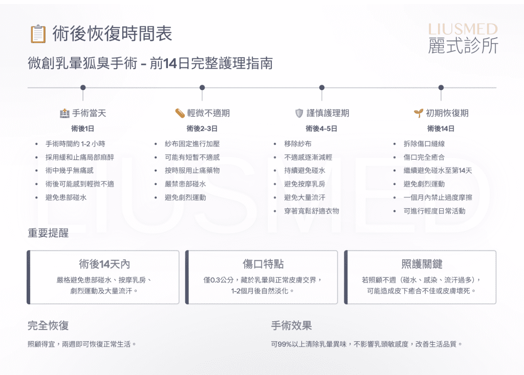 - 避免特定活動: 術後 14 天內,應避免按摩乳房、劇烈運動及大量流汗的活動。