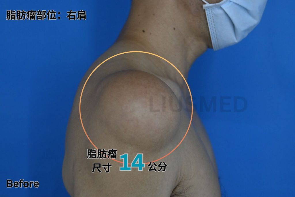 一位 55 歲男性,右肩生長了一顆巨大腫瘤長達 5 年。近期腫塊迅速增大,嚴重影響外觀。他曾諮詢多家醫院,都被告知:「這顆太大了,一定要開大刀,傷口至少 10-14 公分。」而且要住院七天接受開刀。
