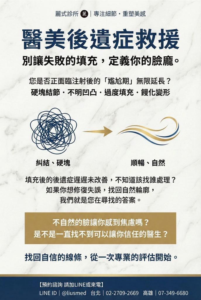 我們知道,因為一次不理想的填充,您對「醫生」這個角色可能充滿了不信任與恐懼。 因此,麗式診所的「醫美救援」服務,更重視術前的精密評估。我們不是要讓您再變一張臉,而是要修復失誤 (Revision)。