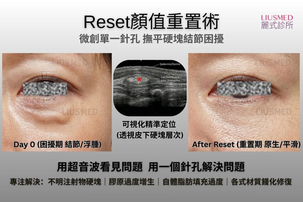 如右圖所示,我們利用「Reset 顏值重置術」,僅僅透過一個微創的單一針孔,就像拆彈一樣,精準地將這些「違章建築」移除。