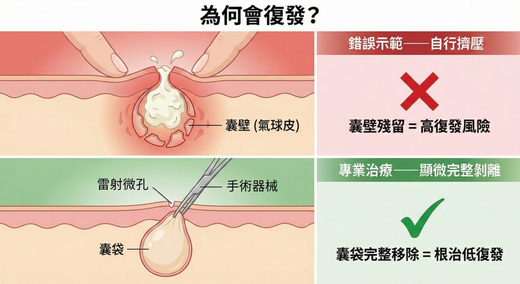 - 低復發率: 復發的主因是囊壁殘留。只要能透過顯微技巧將囊壁完整取出,其復發率與傳統手術一樣低(<5%)。