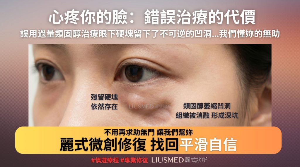 4. 最終結果: 令人震驚的是,目標硬塊並未消失,但類固醇藥物卻導致中臉部蘋果肌與淚溝區域的正常組織嚴重萎縮。最終在臉上留下了三、四個邊界清晰、如同被手指用力壓入般的深刻凹洞。