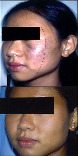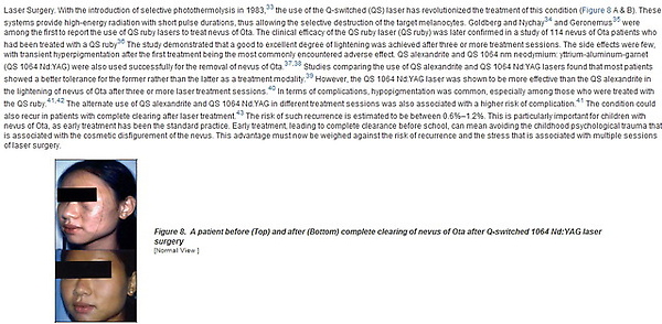 Laser Surgery. With the introduction of selective photothermolysis in 1983, 33 the use of the Q-switched (QS) laser has revolutionized the treatment of this condition (Figure 8 A & B). These systems provide high-energy radiation with short pulse durations, thus allowing the selective destruction of the target melanocytes. Goldberg and Nychay 34 and Geronemus 35 were among the first to report the use of QS ruby lasers to treat nevus of Ota. The clinical efficacy of the QS ruby laser (QS ruby) was later confirmed in a study of 114 nevus of Ota patients who had been treated with a QS ruby 36 The study demonstrated that a good to excellent degree of lightening was achieved after three or more treatment sessions. The side effects were few, with transient hyperpigmentation after the first treatment being the most commonly encountered adverse effect. QS alexandrite and QS 1064 nm neodymium: yttrium-aluminum-garnet (QS 1064 Nd:YAG) were also used successfully for the removal of nevus of Ota. 37,38 Studies comparing the use of QS alexandrite and QS 1064 Nd:YAG lasers found that most patients showed a better tolerance for the former rather than the latter as a treatment modality. 39 However, the QS 1064 Nd:YAG laser was shown to be more effective than the QS alexandrite in the lightening of nevus of Ota after three or more laser treatment sessions. 40 In terms of complications, hypopigmentation was common, especially among those who were treated with the QS ruby. 41,42 The alternate use of QS alexandrite and QS 1064 Nd:YAG in different treatment sessions was also associated with a higher risk of complication. 41 The condition could also recur in patients with complete clearing after laser treatment. 43 The risk of such recurrence is estimated to be between 0.6%–1.2%. This is particularly important for children with nevus of Ota, as early treatment has been the standard practice. Early treatment, leading to complete clearance before school, can mean avoiding the childhood psychological trauma that is associated with the cosmetic disfigurement of the nevus. This advantage must now be weighed against the risk of recurrence and the stress that is associated with multiple sessions of laser surgery.
