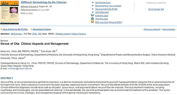 1916年Pusey首先在一中國學生臉上發現,由Ota教授在1938年正式發表此種色素性母斑。主要分佈在三叉神經第一與第二分枝區域的真皮層內,是一種在眼窩周圍皮膚的Blue Nevus。約有一半的人會有眼睛的侵犯至結膜、鞏膜、虹膜、脈絡膜、外眼肌甚至於眼窩都可能侵犯到造成兩眼色素沉著的差異。色素沉著的多寡對眼睛的機能並無影響。