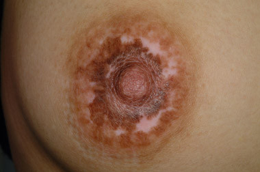 2.後天的因素有:吸吮、懷孕、老化、雌性荷爾蒙分泌、過度刺激乳頭等關係的影響,都會使乳暈漸漸變成黑褐色,形狀也會變大。其中,較為常見的原因,還有是敏感性肌膚或異位性皮膚炎的患者,在乳頭及周遭的乳暈皮膚出現濕疹的皮膚發炎病灶後,留下發炎後的色素沉澱(postinflammatory hyperpigmentation),造成乳暈色澤變深,這種顏色常常需要好幾個月的時間去淡化。