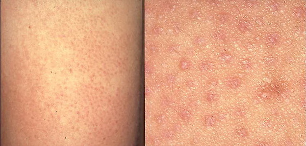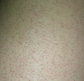毛孔角化?這個名稱聽起來很專業,但它的盛行率卻相當普遍。在美國的調查顯示,約有40%的人患有毛孔角化症。其實許多人都有這種毛病卻不自知。你可以仔細檢查一下自己的皮膚,如果毛孔有一點一點的發紅,甚至摸起來會感覺一粒一粒的凸起,這就是毛孔角化症。再嚴重一點,毛孔的顏色會更深,呈現暗紅或褐色,顆粒也會更粗糙,看起來很像是雞皮疙瘩。病灶的分布區域最常見的依序是上臂(92%)、大腿(59%)、臀部(30%),臉頰也不少見,少數患者會全身分佈。疹子的數目可以從數十顆至數百顆,這些像雞皮疙瘩的疹子,外觀上也非常明顯,常常造成患者不敢穿短袖衣服的困擾。