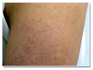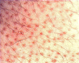 外觀有如針點般的小丘疹,散在性的分佈,顏色呈膚色、紅褐色或棕色,大部份的疹子均無關痛癢。