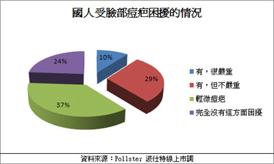 近日,波仕特線上市調網(http://www.pollster.com.tw)也對內容會員進行了一項「痘疤困擾」的網路民調。針對「您的臉部有痘疤的困擾嗎?」調查結果發現,整體受訪者中,回答有「輕微痘疤」者達36.86%,比例最高。其次依序為「有,但不嚴重」(28.89%)、「完全沒有這方面困擾」(23.88%)以及「有,很嚴重」(10.37%),表示「有痘疤問題」者,合計達七成六,比例頗高。其中表示嚴重者,也有一成,可見痘疤問題普遍困擾一般民眾。