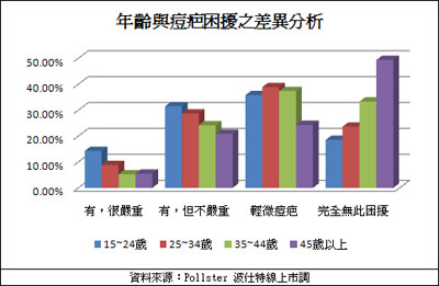 以性別來看,受訪男女對痘疤困擾的調查結果並沒有太大的差異,顯見無分性別,都可能面臨相同的痘痘危機。不過,如果以年齡分佈來看,越年輕越會有痘疤問題,這當然是與人類青春期影響荷爾蒙及內分泌有關。因此,可看到數據中「15~24歲」回答「有很嚴重痘疤困擾」者高達14.25%,占各年齡層最多。總合全部數據,「有痘疤困擾」問題會隨年齡下降而遞升;反之,表示「完全沒有痘疤困擾」者則隨年齡上升而遞減,顯示痘疤問題仍與身體年齡息息相關,也無怪乎治痘、抗痘清潔用品都以青少年為主要行銷目標群。