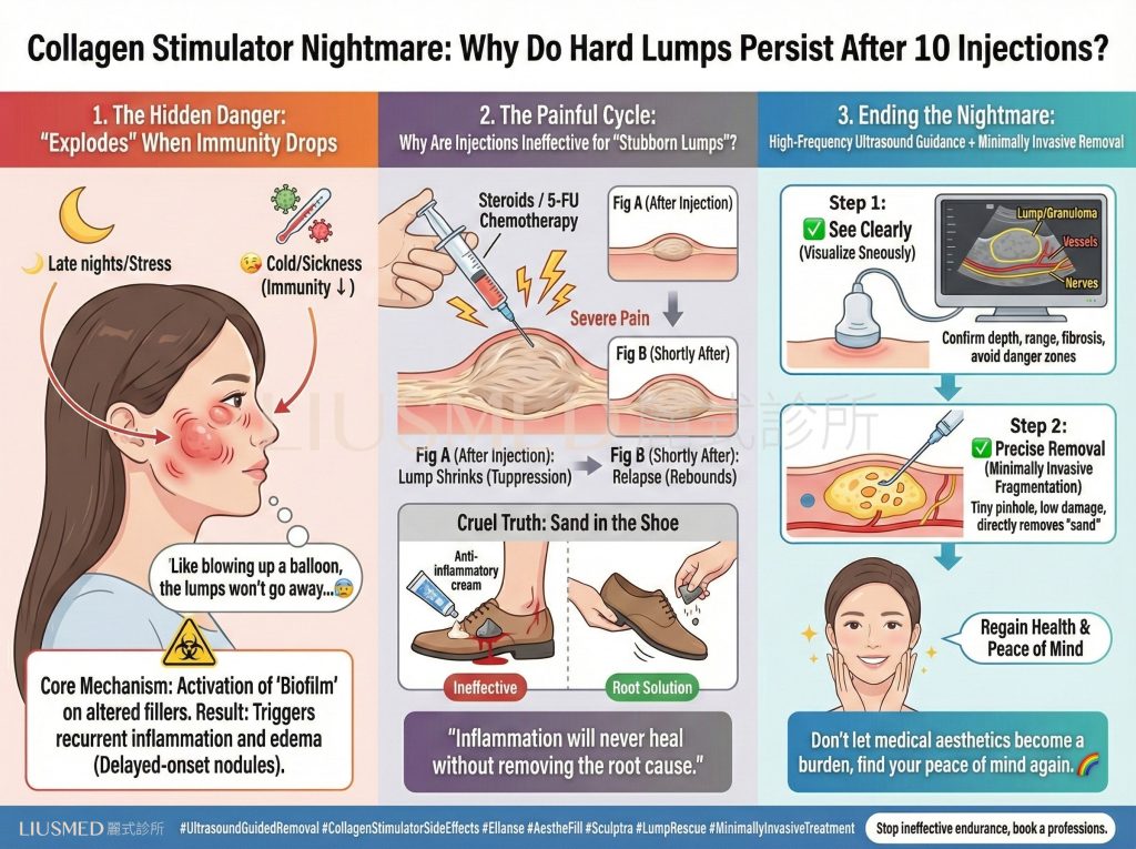 If you are suffering from Ellansé lumps, AestheFill nodules, or recurring facial swelling, please stop the ineffective and painful endurance. “Extraction” may sound intimidating, but under ultrasound guidance, it is actually a safer and more fundamental solution than repeated chemotherapy injections.